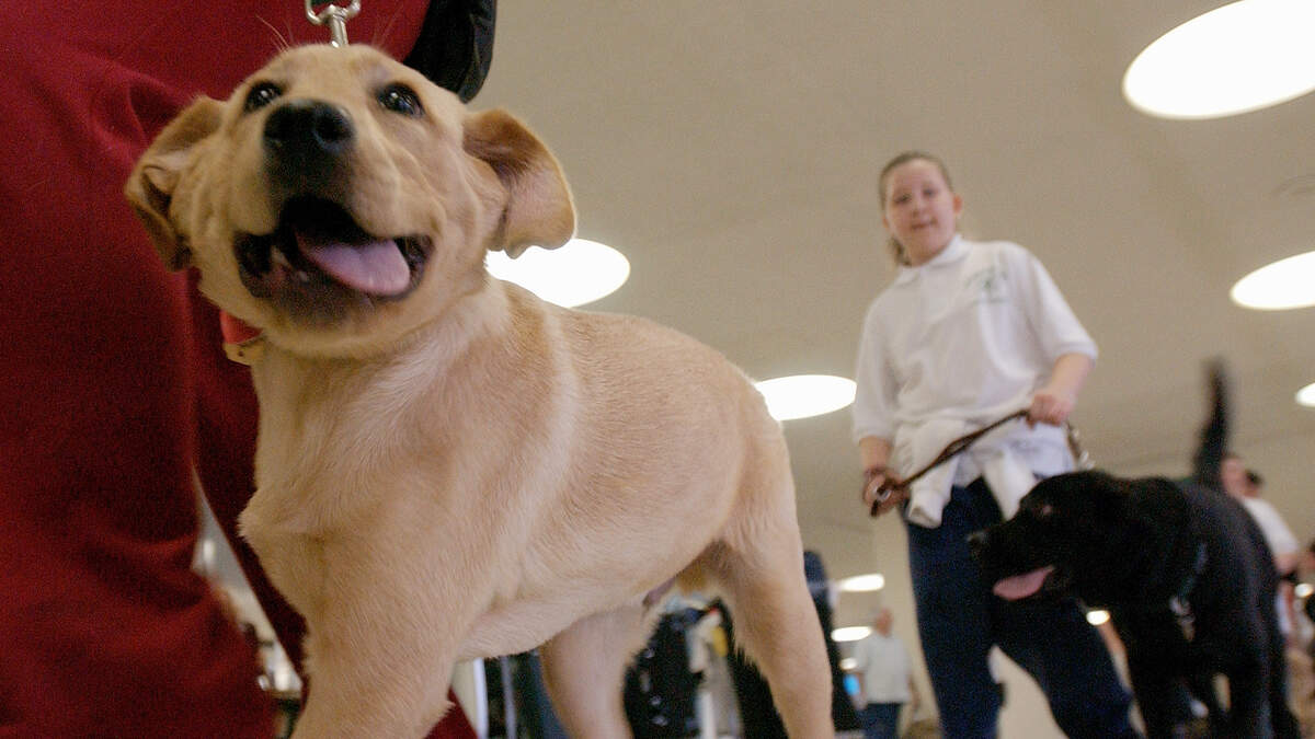 The study used 375 puppies that were bred to be service dogs. They were Labrador retrievers, golden retrievers, or a mix of both breeds. In one experiment, a researcher sat between two cups. They would call out to the puppy and point to a cup, which contained a treat. Some of the puppies responded to the gesture and ran straight to the cup.